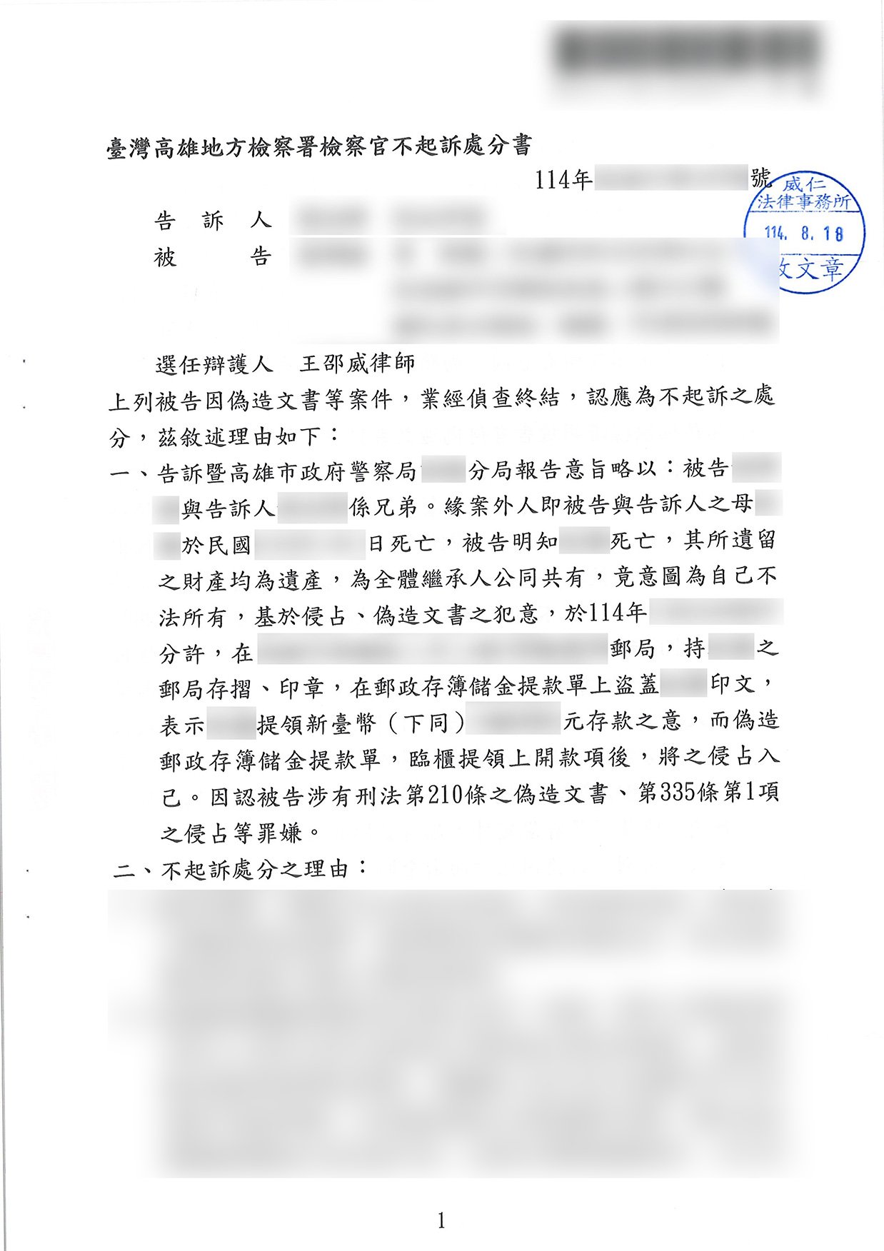 成功案例分享:偽造文書、侵占案件成功獲取不起訴處分