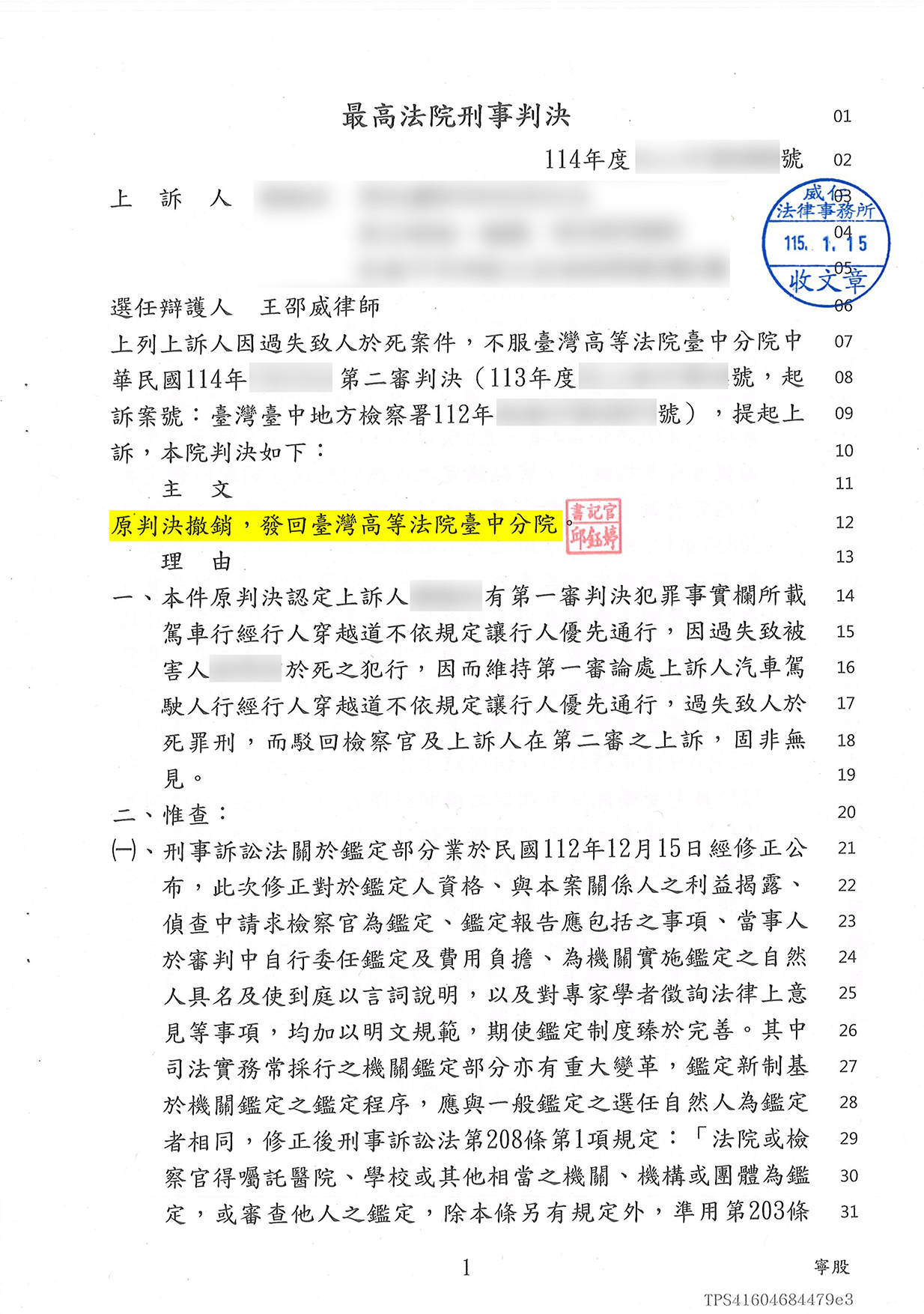 最終,最高法院作成判決,撤銷原判決,發回高等法院重新審理,成功替當事人爭取重新審酌事實與法律的機會。