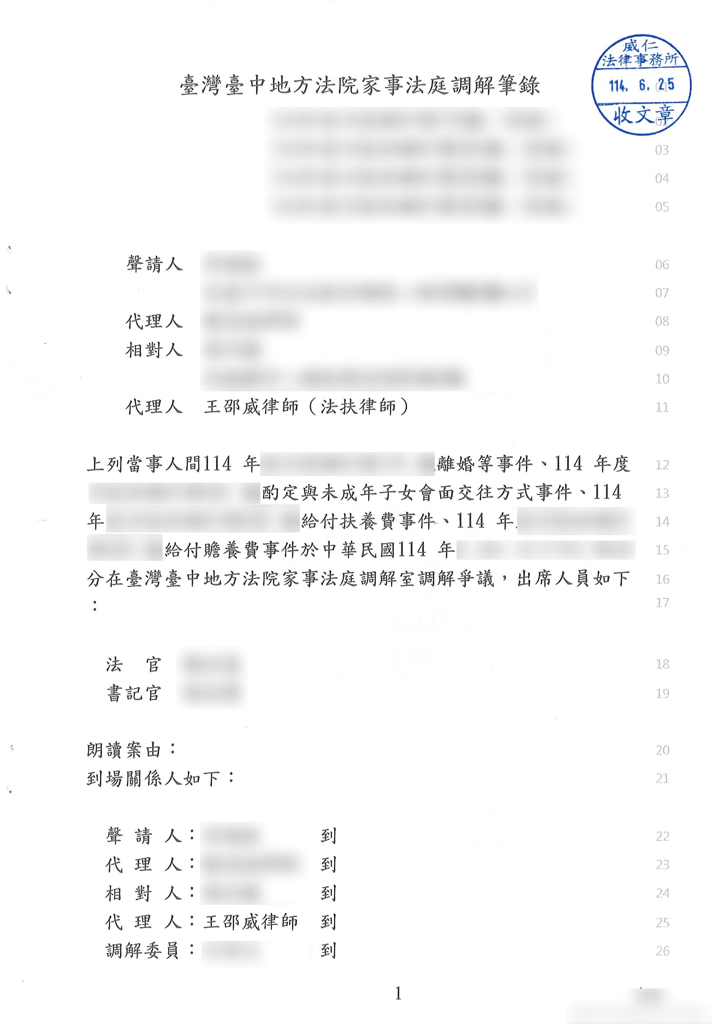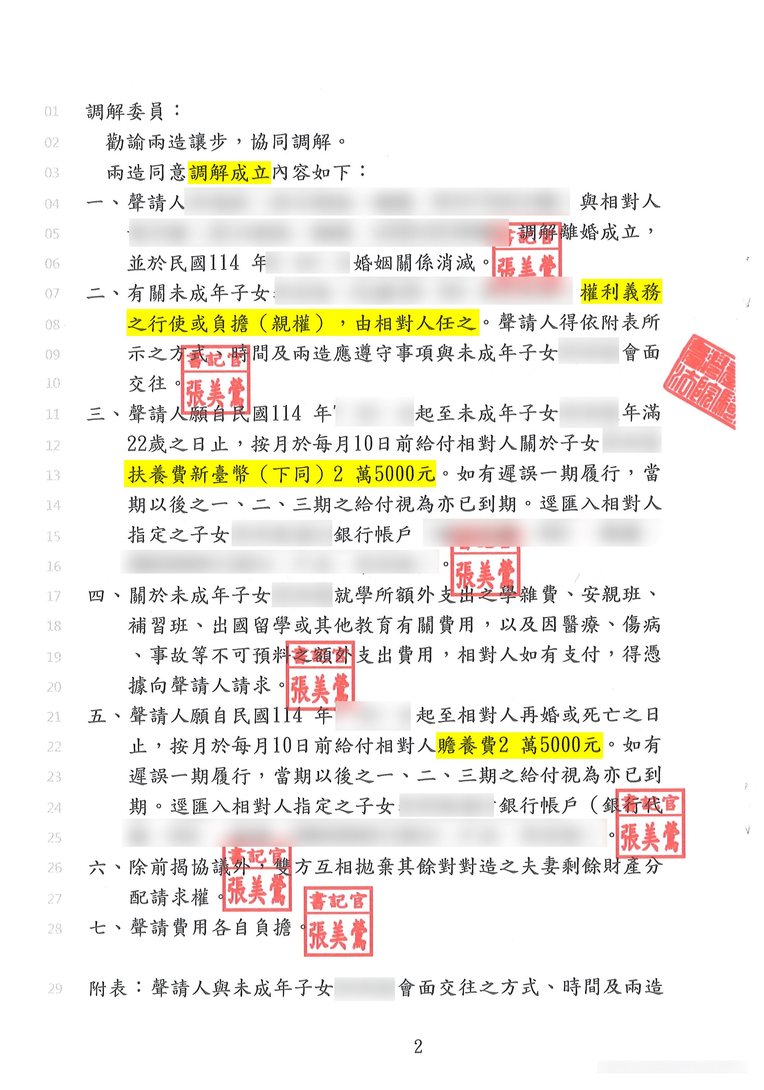 調解結果:調解離婚成立,成功爭取單方監護、每月2萬5000元贍養費及2萬5000元扶養費。
